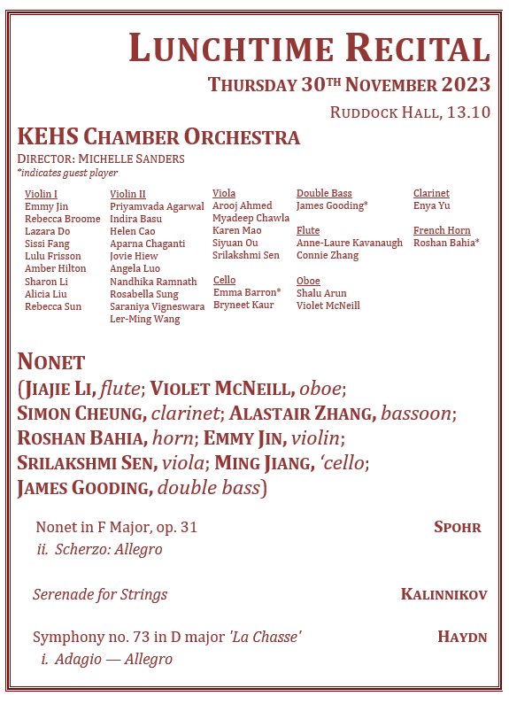 On Friday 17th November, three chamber groups of KES and KEHS students performed at the Elgar Concert Hall as part of the University of Birmingham’s Concert Series. The repertoire featured Beethoven’s Wind Octet, Weber’s Clarinet Quintet, and Juon’s Piano Sextet; all of which were mature and high calibre performances. Well done to all who took part and thank you to Mr Ash for the photos.