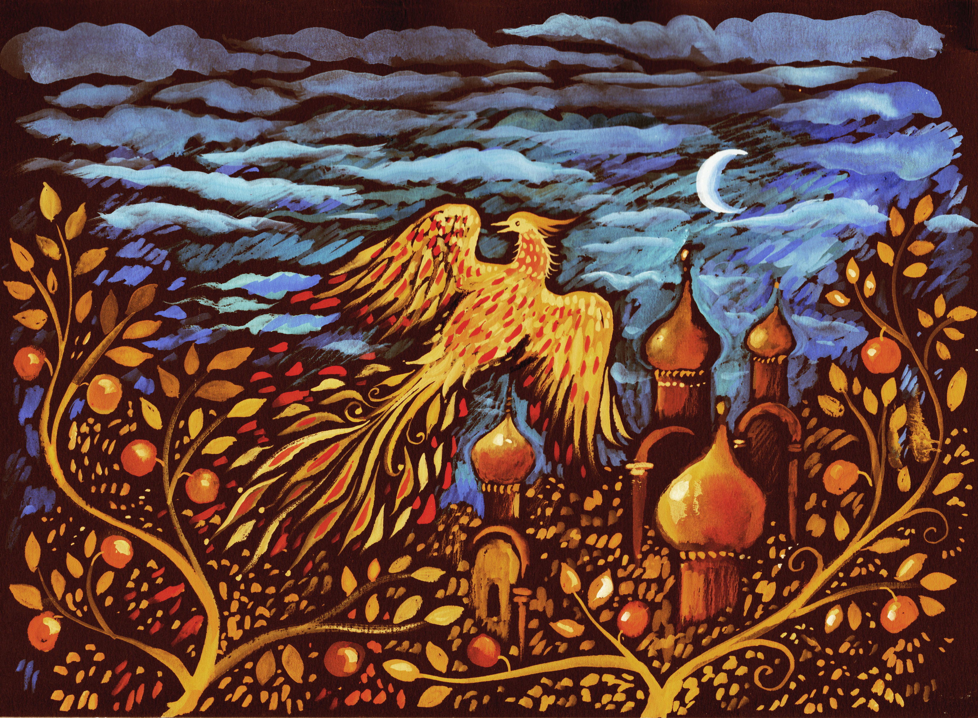 Ivan is already in love with the princess and determined to rescue the her; but the wizard and his servants capture Ivan, and tie him up. The wizard Kaschei attempts to cast a spell, but Ivan uses the golden feather to summon the Firebird. The Firebird enchants everyone with a song, which sends all but Ivan into a deep sleep. She then guides Ivan to a golden apple tree, where, in the roots, is hidden the egg containing the wizard’s magic.