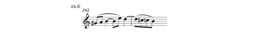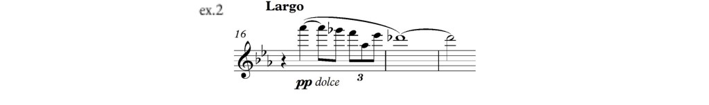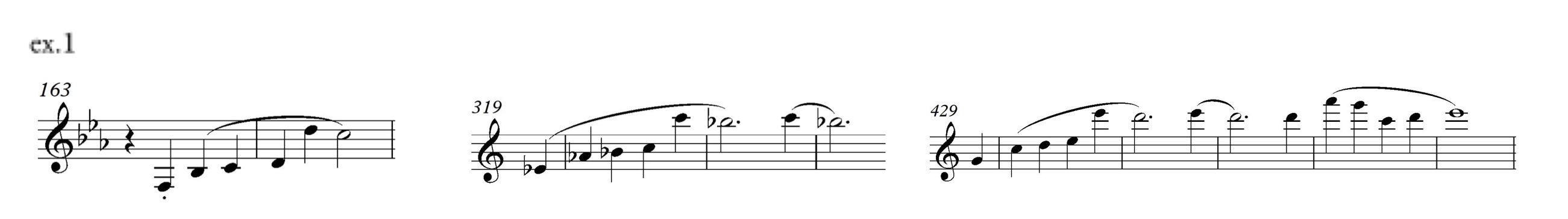 As shown in ex.1, the transfiguration theme is first heard as a 6-note fragment, whilst at b.319 the final two notes are repeated. At the transfiguration at b.429, the theme is extrapolated into an expansive melody on the key of C major. The arrival on this key is also hermeneutically noteworthy, given the associations drawn in the Viennese classical tradition between C major and notions such as purity and perfection. Whilst this interpretation may not have been a specific intention of Strauss, there is thematic significance in the ideas of redemption which are easily drawn from the transformation of the brooding C minor at the opening into the bright and dazzling tonality of C major.