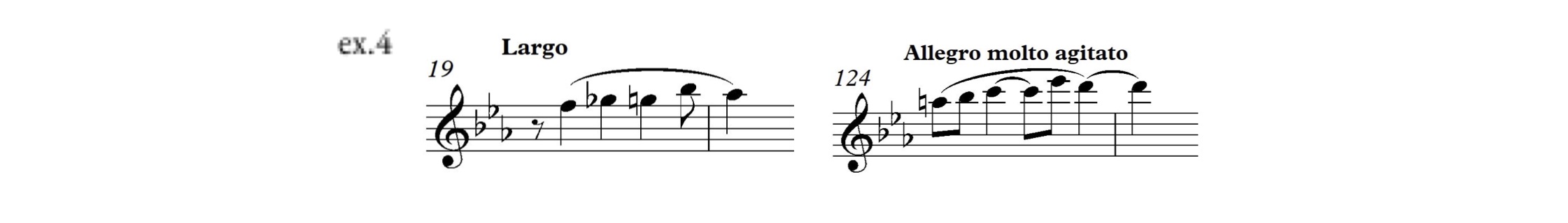 The ‘life’ theme (ex.4 – b.124) is also significant throughout Tod und Verklärung. It is often used in counterpoint with the themes representing death, in order to constitute the fervent struggle between life and death within the music. In ex.4, the chromatic rising oboe motif (b.19) from the opening section appears as the progenitor of the life theme. (b.124)
