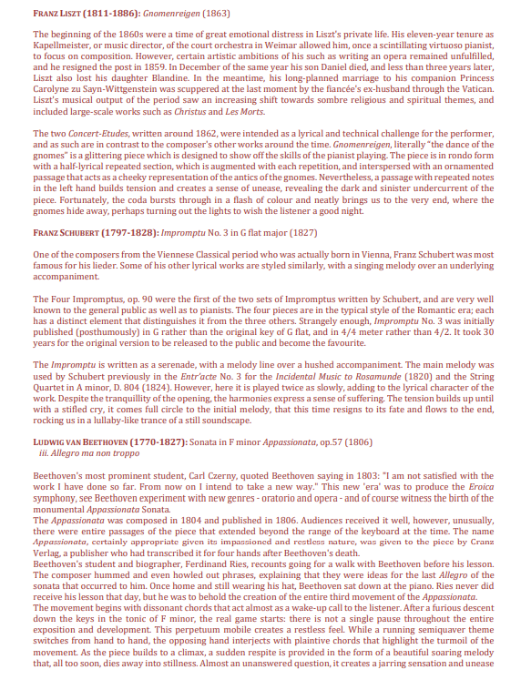 Requiring words in order to explain music in detail is not a weakness of musical study, although the inability to understand fully and communicate music purely on its own terms is often regrettably viewed as such. The relationship between language, speech and music is closely interlaced. According to resemblance theories16 of musical expressiveness, we find musical material to be happy or sad in nature partly based on resemblances between speech and melodic contours. For example, sprightly music consisting of series of leaps often occurs to us as happy in nature whilst slower, descending melodies tend to strike us as more melancholy. In an embodied sense, this musical material resembles human physical behaviour. If one maintains that, in a Schopenhauerian sense, music can communicate a reality which lies beyond the capability of linguistic expression, words are still a useful medium for explaining musical concepts in a way that can achieve greater understanding. In this case, the written programme allows for common understanding of the work, whilst not being requisite for an interpretive view of the music, nor the ontology of the work.